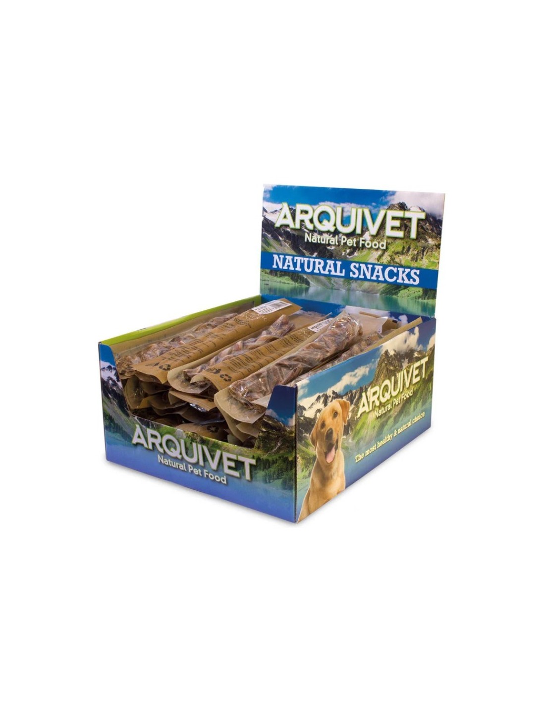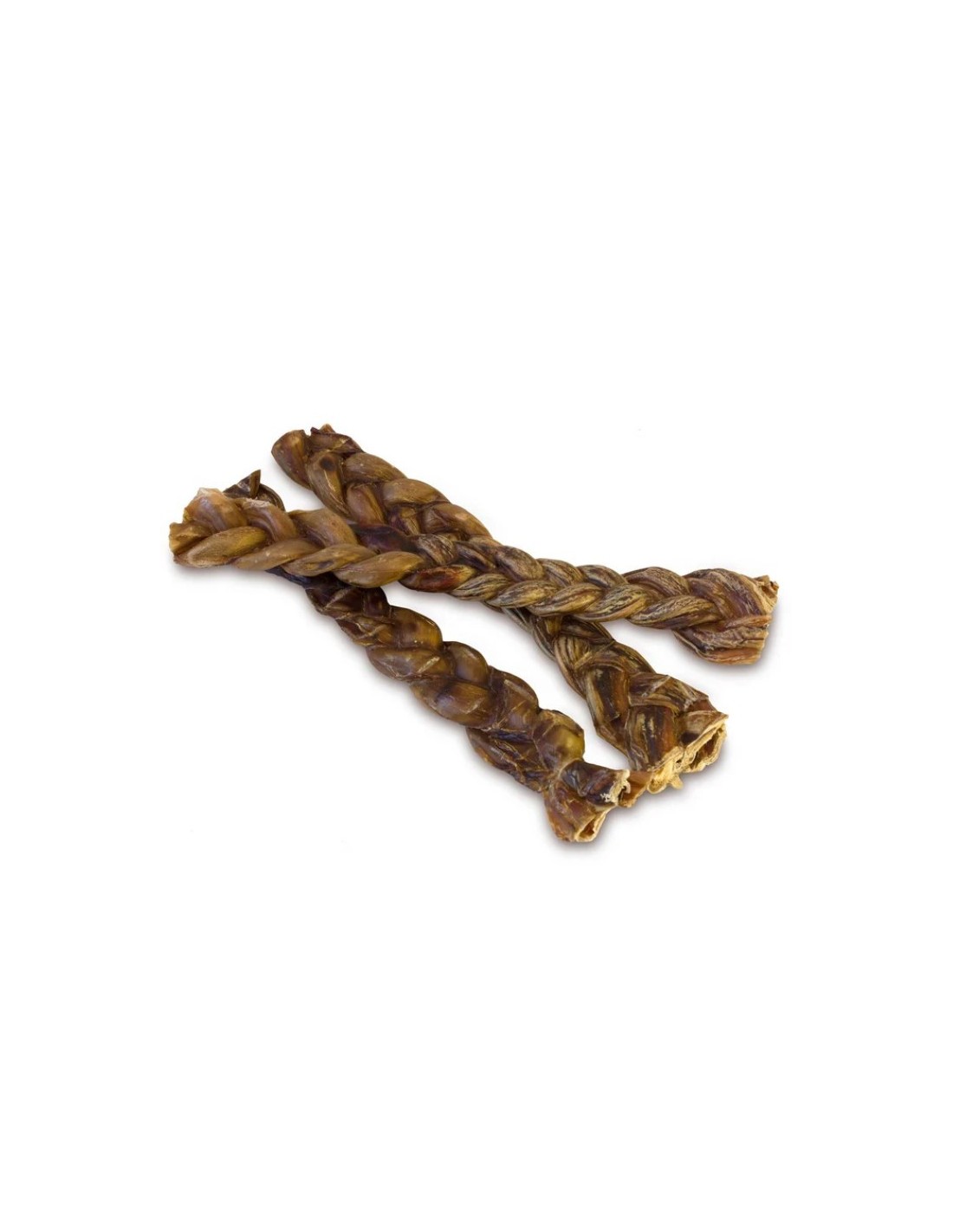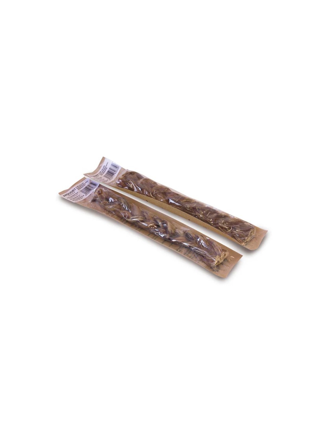 Snack 100% natural para perros elaborado con nervio de cerdo secado y curado dispuesto en forma de trenza, que aporta proteinas de orígen animal, digeribles fácilmente por los perros y ayuda a fortalecer la dentadura de los perros. Medida aproximada 20 cm. Envasado individual según normativa alimentaria.